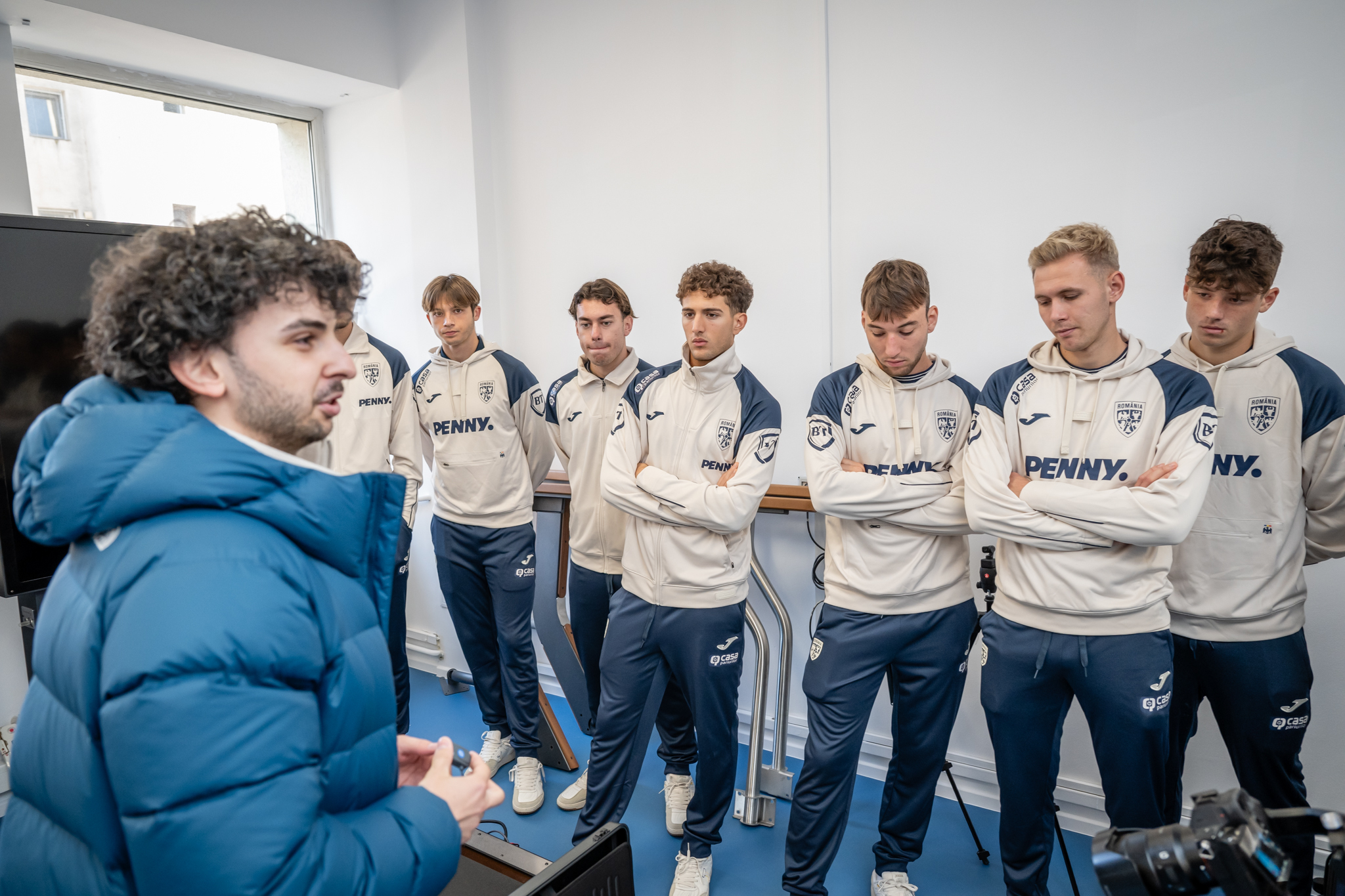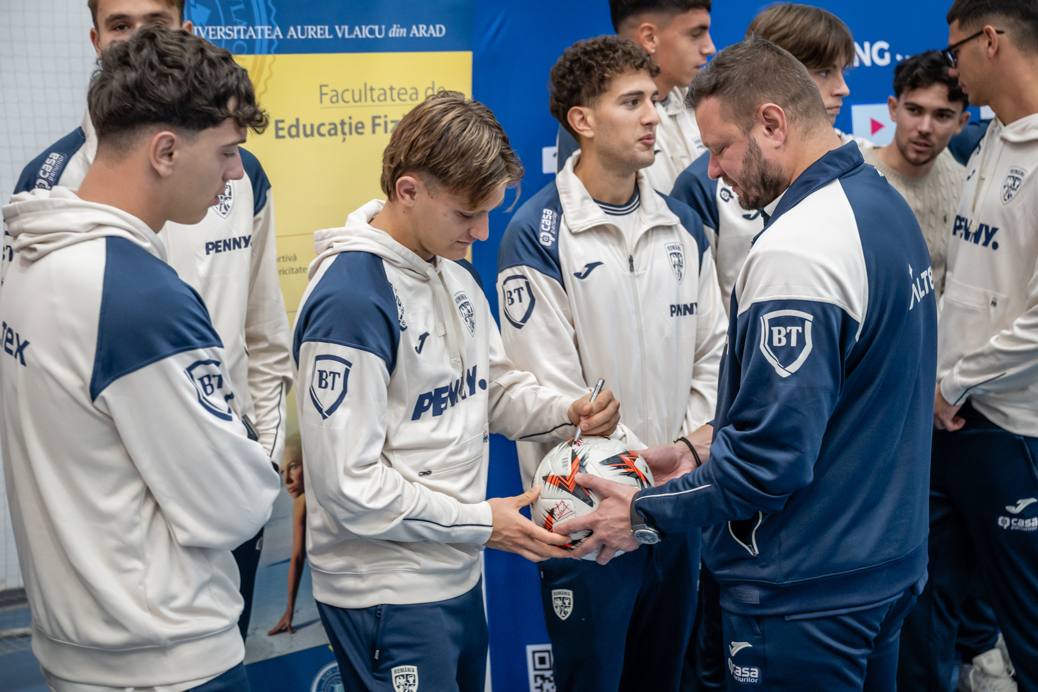 Before their match against Serbia’s U21 team, the Romanian Under-21 national squad visited the Faculty of Physical Education and Sports within Aurel Vlaicu University of Arad. The visit took place in a relaxed atmosphere filled with smiles and photo opportunities, especially around the Arad-born players Cristian Mihai, Cătălin Vulturar, and Rareș Pop, for whom this stop in Arad was also a reunion with former schoolmates and club colleagues.