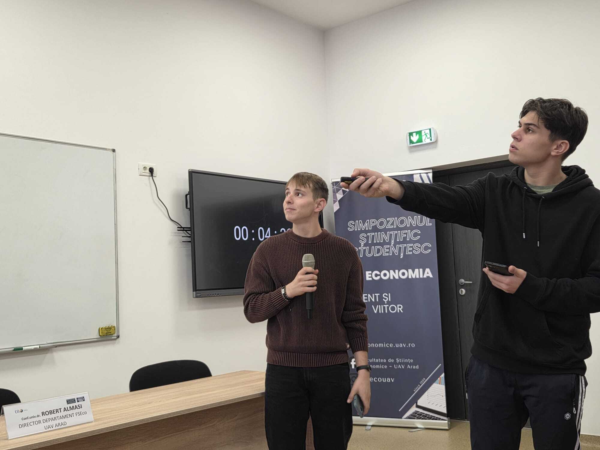 Over 70 students from multiple university centers participated either in person or online in the 26th edition of the Student Scientific Symposium “Economy – Present and Future.” The event, organized by the Faculty of Economic Sciences at “Aurel Vlaicu” University of Arad (project coordinator: Assistant Professor Dr. Melinda Petronela Luca) with the support of the Ministry of Education and Research, provides students with the opportunity to engage in debates on current economic and financial topics.